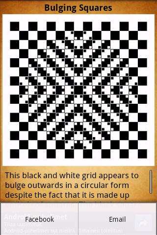 v1.3 Social share added. Now it is possible to share the image and description of the illusion by email or Facebook. In order to share just press the Menu Button when watching an illusion.