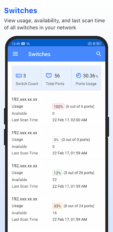 आईपी उपलब्धता, संबंधित मैक पते, उपयोगकर्ता, स्थान और अधिक पर विस्तृत जानकारी के साथ अपने नेटवर्क के सभी आईपी पते सूचीबद्ध करें।