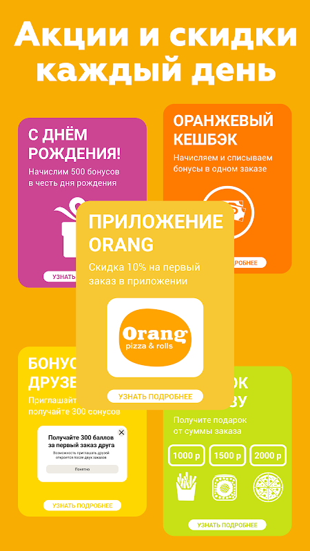 आप वेबसाइट ओरान-जी.आरयू पर, फोन 88003006603 पर या ओरंग मोबाइल एप्लिकेशन · पिज्जा और रोल की डिलीवरी पर डिलीवरी या पिकअप के लिए ऑर्डर दे सकते हैं। और ओरंग आपके घर छुट्टियाँ लाएगा!