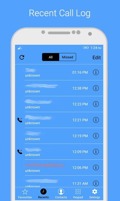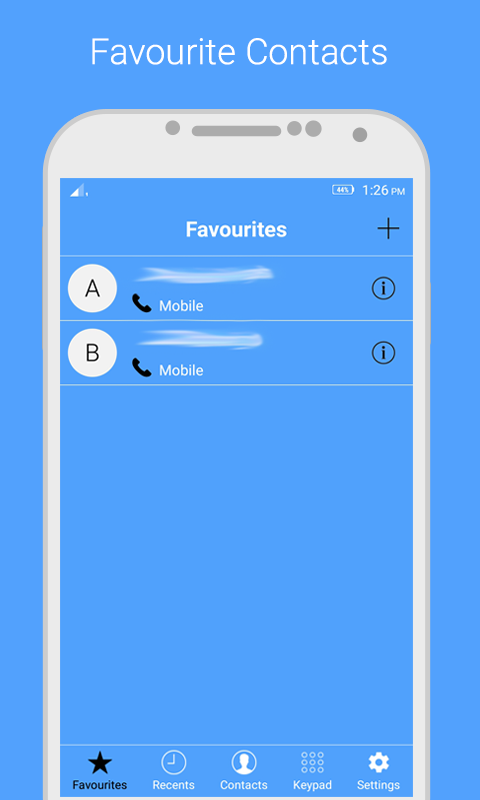 - For frequently used features: Favourites (Favorites), Recents, Contacts, and Keypad.