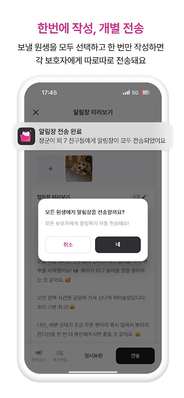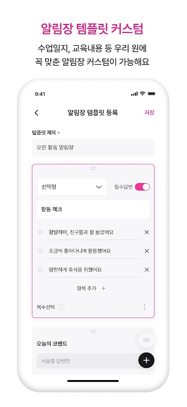 - 이제 알림장을 우리 유치원 스타일에 맞게 템플릿으로 저장하고 불러올 수 있어요.