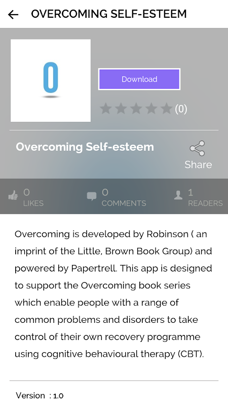 कम आत्म-एस्टीम पर काबू पाने से आपको वह समर्थन मिलता है जो आपको अपने आत्मविश्वास को बढ़ाने की आवश्यकता है। आत्म-मूल्यांकन तराजू आपको यह निर्धारित करने में मदद करते हैं कि क्या आपको कम आत्म-सम्मान के साथ कोई समस्या है। सरल उपकरण आपको संज्ञानात्मक व्यवहार थेरेपी (सीबीटी) का उपयोग करके अपने स्वयं के पुनर्प्राप्ति कार्यक्रम को नियंत्रित करने में मदद करते हैं। एक ऑनलाइन कैटलॉग में कम आत्मसम्मान के लिए पढ़ने की सिफारिश की गई है और इन पुस्तकों को ऐप के अंतर्निहित ई-रीडर के भीतर उपयोग के लिए ई-पुस्तकों के रूप में खरीदा जा सकता है।