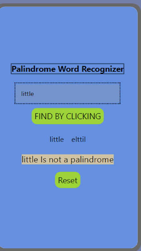 जब ऐप खुलेगा तो टेक्स्ट बॉक्स के साथ सिंगल स्क्रीन ऐप होगा। यदि आप टेक्स्ट बॉक्स में लिखते हैं 1. सुनिश्चित करें कि शब्द लोअरकेस है और 2. क्लिक करें, "क्लिक करके ढूंढें," जब आप देखते हैं कि शब्द एक पैलिंड्रोम शब्द है या नहीं, तो "रीसेट करें" पर क्लिक करें और सब कुछ खाली हो जाएगा आपके पास फिर से जाने के लिए रिक्त स्थान छोड़ रहा है। जब आपका काम पूरा हो जाए, तो ऐप से बाहर निकलें।