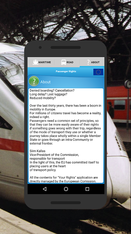 Passenger Rights gives clear and concise information on travel rights in the European Union. The question/answer format makes it easy for you to identify the problem you're having and get a clear explanation of your rights concerning that problem, and the options available to you.