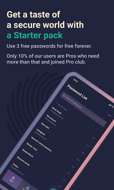 • मुफ़्त टियर: 3 पासवर्ड, पिन या क्रेडेंशियल तक पूरी तरह से मुफ़्त में स्टोर करें।