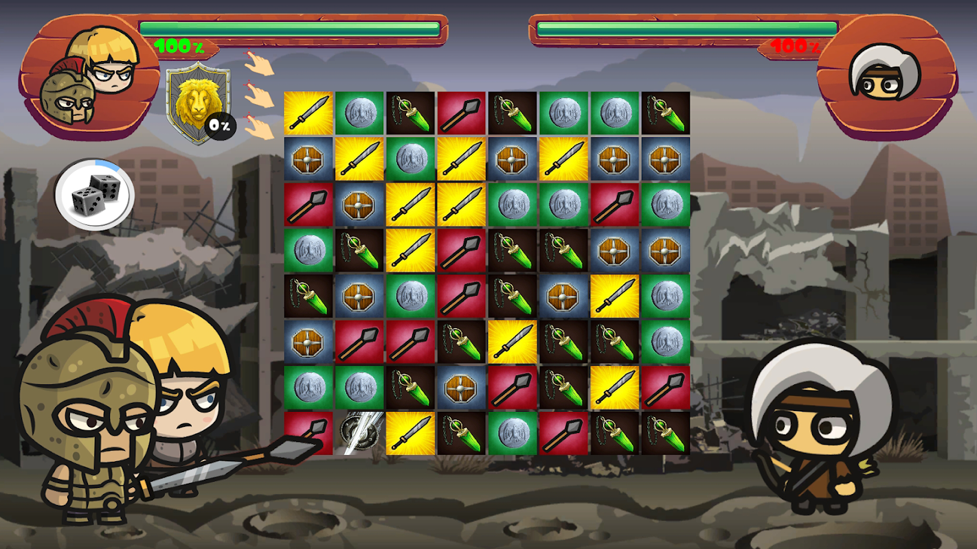 Swords will make the knight attack, hammers will make the Viking attack, vials will heal some of your lost HP, shields will block enemy attack when it is fully loaded and coins will earn you coins at level’s end! You have three moves and then it’s your opponent’s turn and the process repeat like this.