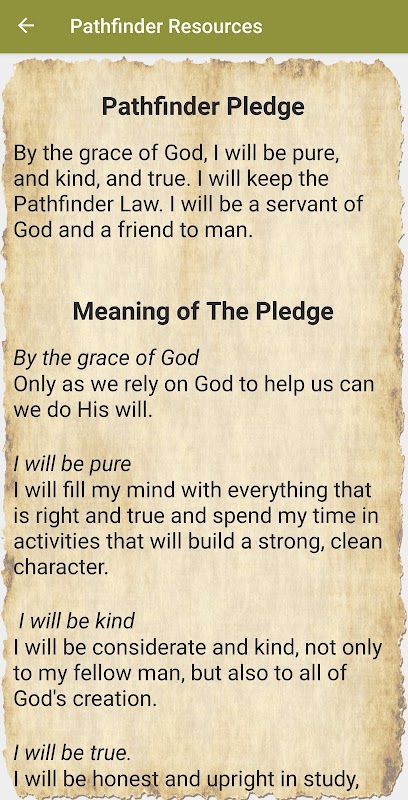 यह अलंकरण उपलब्धि वर्ग स्तर की आवश्यकताओं और भक्ति गाइड के साथ एक खंड भी पेश करता है। ऐप में डाउनलोड करने योग्य पाथफाइंडर गाइड भी हैं, और पाथफाइंडर प्रतिज्ञा, कानून, गीत और इतिहास जैसे पाथफाइंडरिंग के बारे में सामान्य जानकारी है।