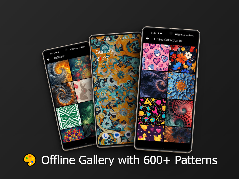 अपनी उंगलियों पर, ऑफ़लाइन पहुंच योग्य 600 से अधिक हाई-डेफिनिशन पैटर्न वॉलपेपर के क्यूरेटेड संग्रह का आनंद लें। कोई इंटरनेट नहीं? कोई बात नहीं! आपके पसंदीदा पैटर्न हमेशा उपलब्ध हैं।