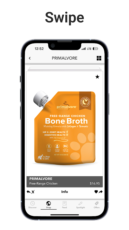 बस कुछ ही स्वाइप और क्लिक के साथ आसानी से अपने पालतू जानवरों के लिए सही आइटम ढूंढें। हमारी स्वाइप सुविधा के साथ, आप ब्रांडों को तुरंत बता सकते हैं कि आपको कोई उत्पाद पसंद है या नापसंद है, जिससे उन्हें अपने पालतू जानवरों की ज़रूरतों के अनुसार उनकी पेशकश को बेहतर बनाने और तैयार करने में मदद मिलेगी।