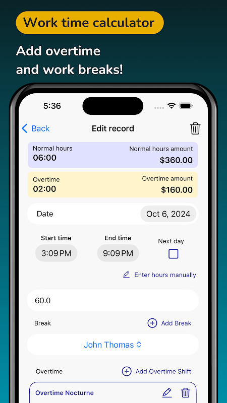 अपने काम के घंटे रिकॉर्ड करें, ओवरटाइम जोड़ें और वेतन कैलकुलेट करें।
