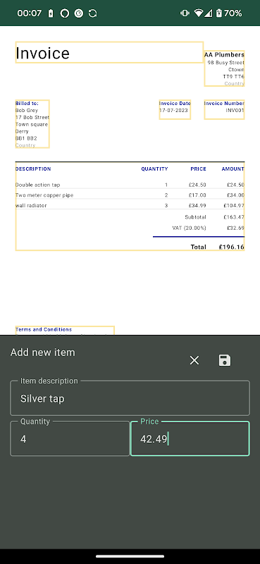- अन्य नए चालानों में उपयोग के लिए ऐप डेटाबेस में पते, ग्राहक, आइटम/सेवाएं और अन्य विवरण सहेजें