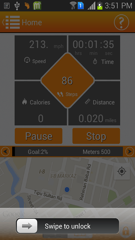 Pedometer Runner tracks your steps while running or jogging to help you reach the goal you have set. By tracking your duration, distance and speed, user can use it to set a new personal record and check your stamina. The application has an interactive and user friendly interface. All the information about exercise selected by the user containing the number of steps taken, number of calories burned, the distance traveled, the speed, the route map and goal set by the user is displayed on one screen and you can easily take a look of it while running. The app will notify you if you complete your goal. The app also provides the user a guide about running and jogging habits. User can also track his/her progress with a detailed list of history maintained in Pedometer Runner.