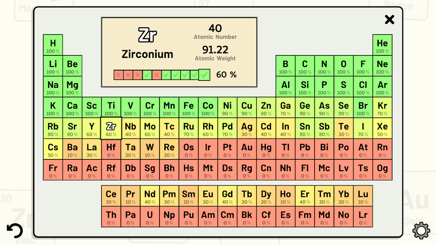 आवर्त सारणी क्विज़ ऐप के साथ उपलब्ध कई अनुकूलन योग्य क्विज़ का उपयोग करके रासायनिक तत्वों के बारे में अपने ज्ञान का परीक्षण करें और उसे बेहतर बनाएँ।