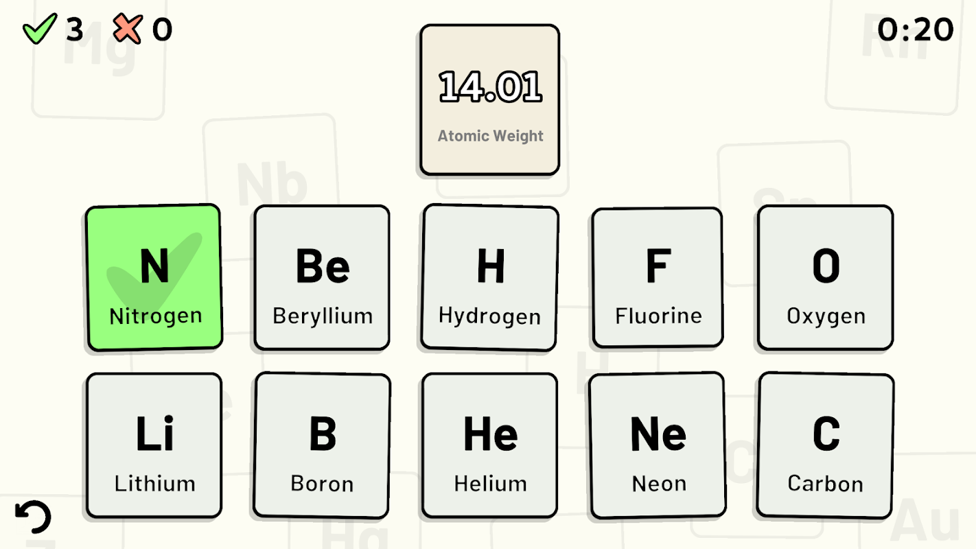 इस ऐप का उपयोग करके सभी 118 रासायनिक तत्वों के परमाणु संख्या, भार, प्रतीक और नामों का निःशुल्क अध्ययन किया जा सकता है। एक एकल इन-ऐप खरीदारी उपलब्ध है जो मेनू विज्ञापनों को हटा देती है।