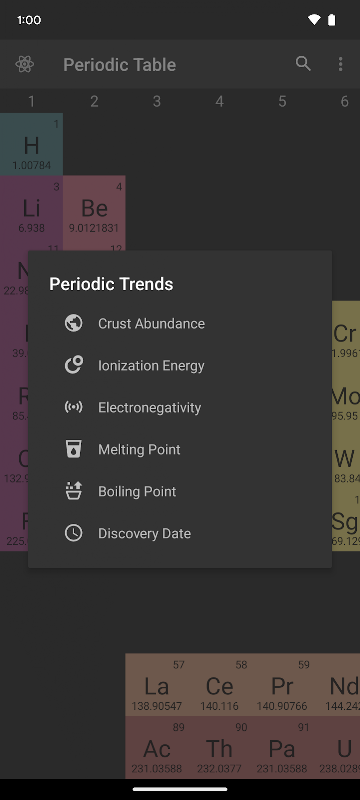 यह आवर्त सारणी पर तत्वों के बारे में जानकारी के लिए एक संदर्भ एप्लिकेशन है। तत्व प्रतीकों, नाम, बड़े पैमाने पर, समूह, अवधि, संयोजी इलेक्ट्रॉनों, वैद्युतीयऋणात्मकता, और भी बहुत कुछ शामिल हैं। इसके अलावा, वहाँ एक रंग ढाल के माध्यम से दिखाया आवधिक प्रवृत्तियों कर रहे हैं। का आनंद लें।