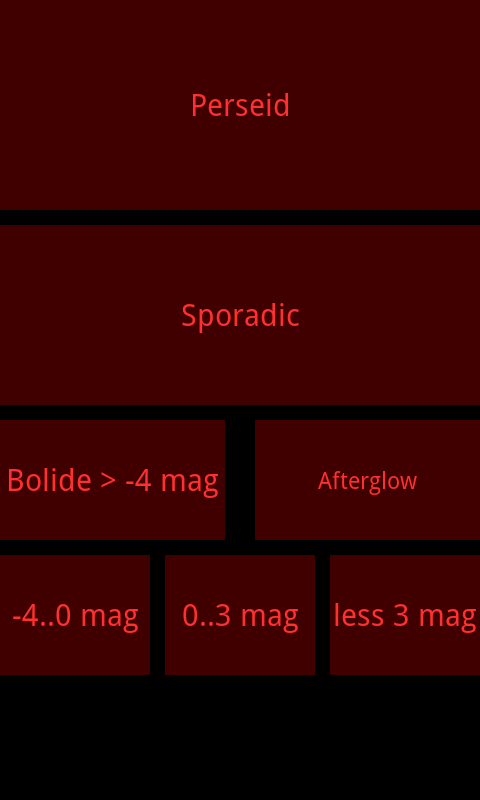 रिकॉर्डिंग और दृश्य उल्का अवलोकनों के आसान लॉगिंग के लिए एक छोटा सा ऐप। इसमें बड़े लाल बटन हैं जो आपकी आंखों के अंधेरे आकाश अनुकूलन को खराब नहीं करते हैं। डेटा एसडी कार्ड (पथ: sdcard \ Perseids.log) पर संग्रहीत किया जाता है। आप स्प्रेडशीट सॉफ़्टवेयर के साथ लॉग का विश्लेषण कर सकते हैं, उदा। खुला कार्यालय।