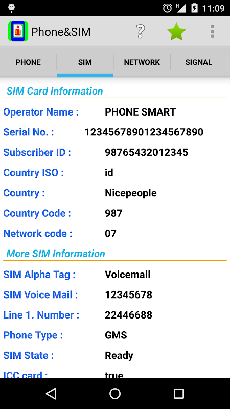 साथ फोन और सिम यह इस तरह के रूप में पांच क्षेत्रों में प्रस्तुत 100 से अधिक डेटा के साथ, smartphones के कई भाग की जाँच करें और सत्यापित करने के लिए संभव है, फोन, सिम, नेटवर्क, सिग्नल और विशेषताएं ।