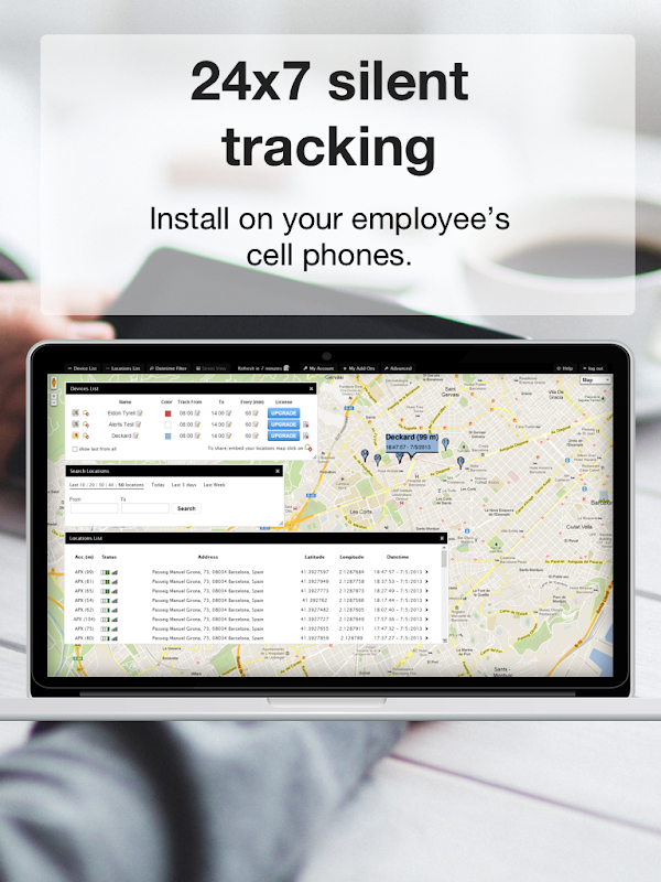 Just install Phone Tracker mobile app on your business devices and log in your account to get a Google Map showing real-time location of all your employees.