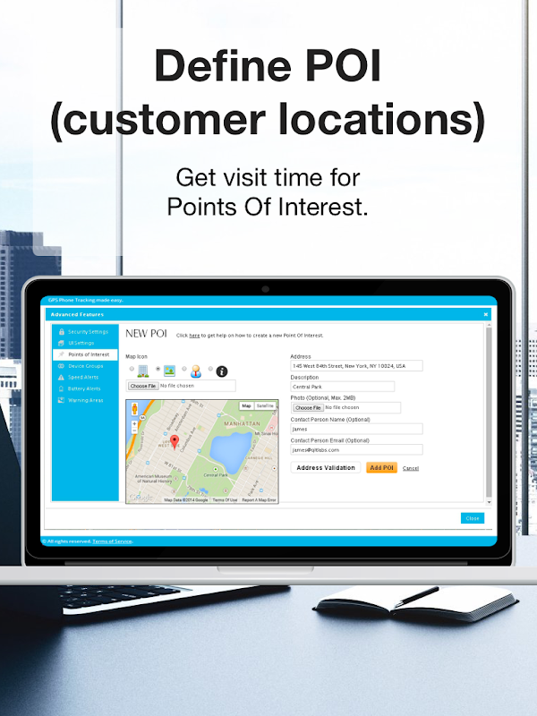 Points Of Interest are GPS locations you define on the map to set for example one of your customer's office. By setting those POIs and using the available business reports you can get the time your employees spend on a customer visit or at the headquarter.