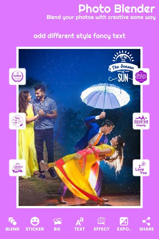 अपनी सामान्य दैनिक तस्वीरों को आसानी से अधिक रोचक बनाएं, बस अपनी गैलरी से एक तस्वीर का चयन करें या कैमरे से कैप्चर करें और इस तस्वीर को हमारे मौजूदा आश्चर्यजनक चित्र संग्रह के साथ मिलाएं या कैमरा / गैलरी से एक और तस्वीर चुनें और एक अद्भुत परिणाम प्राप्त करने के लिए उन्हें एक साथ मिलाएं।