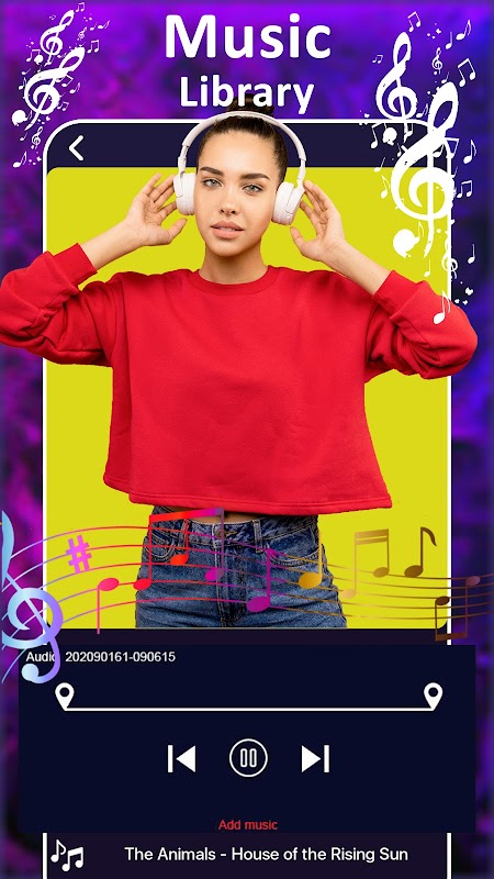 मैत्रीपूर्ण और उपयोग में आसान इंटरफ़ेस, आप संगीत के साथ फ़ोटो वीडियो बनाने के लिए हमारी ऑडियो लाइब्रेरी से संगीत का चयन कर सकते हैं, जिससे आपके वीडियो जीवंत हो जाएंगे।