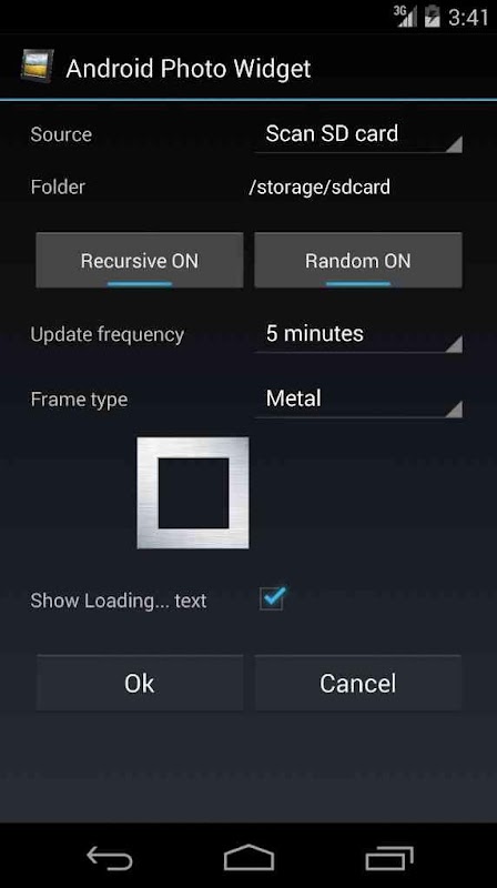 This WIDGET offers 3 different sizes, searching picture on your sd-card. Recursive scan, many borders, option to randomize the order, timed slideshow, image rotation and full screen view with pinch to zoom!
