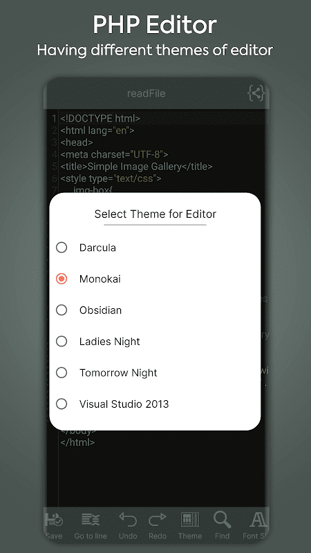 PHP प्रोग्रामिंग सीखें और PHP संपादक के साथ अपना अभ्यास करें। PHP फ़ाइल व्यूअर पूर्ववत करें, फिर से करें, ढूंढें और बदलें विकल्प का समर्थन करता है जो कोड को कोड या संपादित करते समय डेवलपर को बहुत मदद करता है।