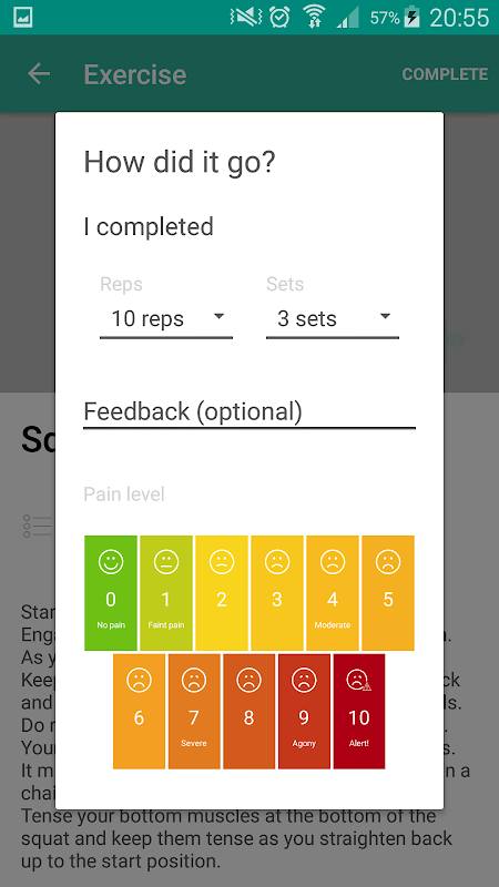 With PhysiApp, you can securely report back to your physiotherapist or chiropractor how much you completed of a given exercise, and if you felt any pain.