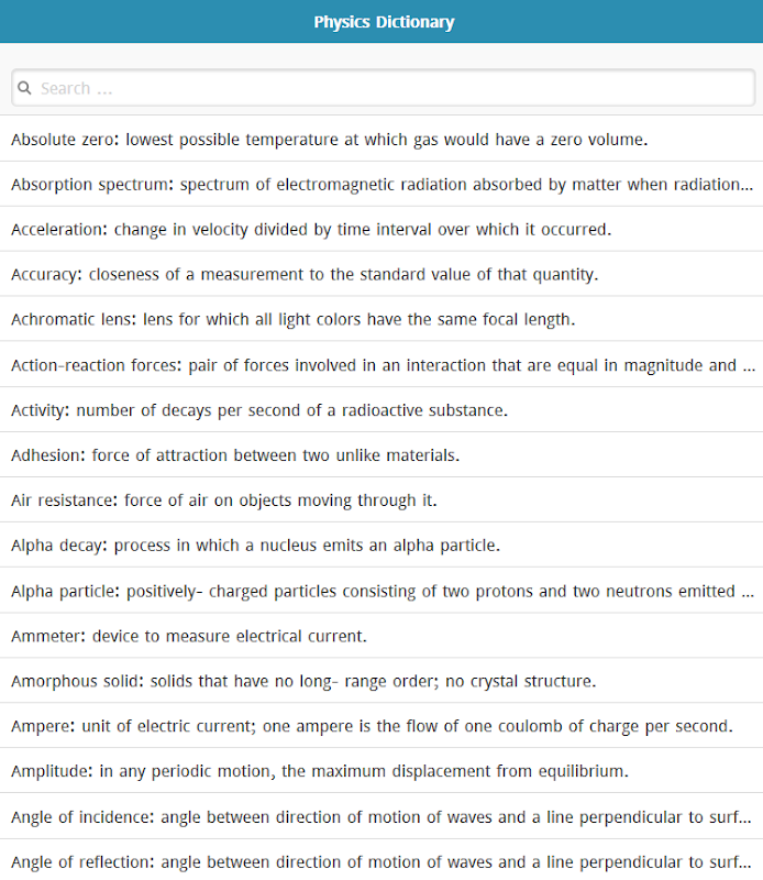 भौतिकी शब्दकोश छात्रों के लिए सभी आवश्यक नियम और परिभाषाओं में शामिल है।