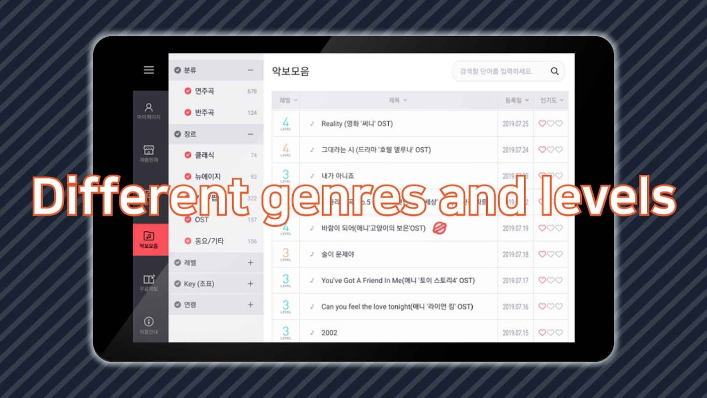 — पियानो स्कूल 6 स्तरों में शीट संगीत प्रदान करता है - शुरुआती स्तर से Lv.5 तक -