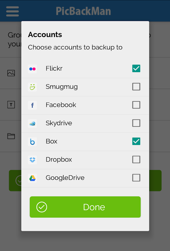 PicBackMan is the #1 automatic photo & video backup application for users in 130+ countries globally. Backup your previous memories to Flickr, Picasa, Dropbox, Box, Google Drive, Facebook , Smugmug and Sky Drive.