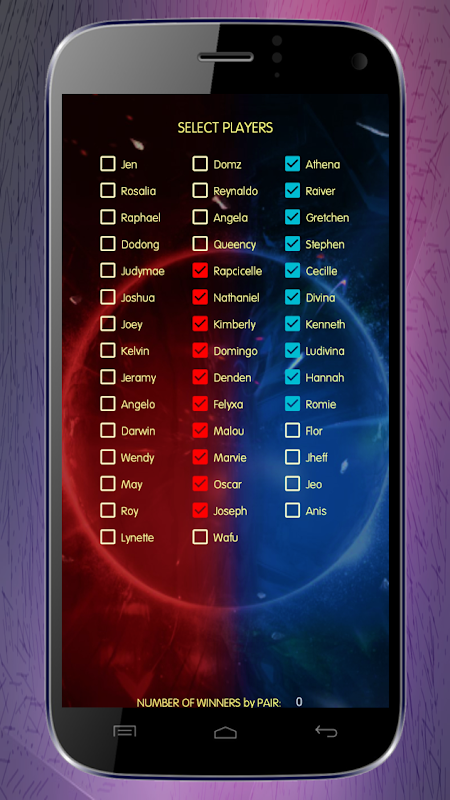 वर्सेज मोड ऐप को वैकल्पिक रूप से टू ग्रुप से बेतरतीब ढंग से चुनने देता है। परिणाम होगा: टीम 1 से 1 व्यक्ति बनाम टीम 2 से 1 व्यक्ति।