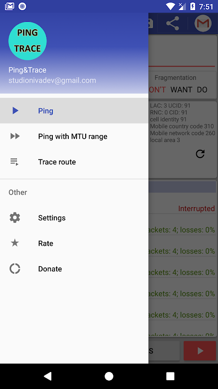 यह एप्लिकेशन सिस्टम के "पिंग" कमांड का उपयोग करता है। इस ऐप से आप न केवल समान मापदंडों के साथ बल्कि विभिन्न एमटीयू (रेंज) या अलग टीटीएल (1 से 30 तक की सीमा) के साथ कमांड चला सकते हैं।