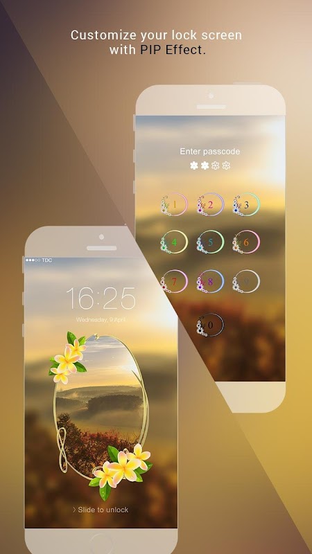 We provide beautiful themes with PIP effect for Main Lock screen and wonderful passcode screen with customized button.