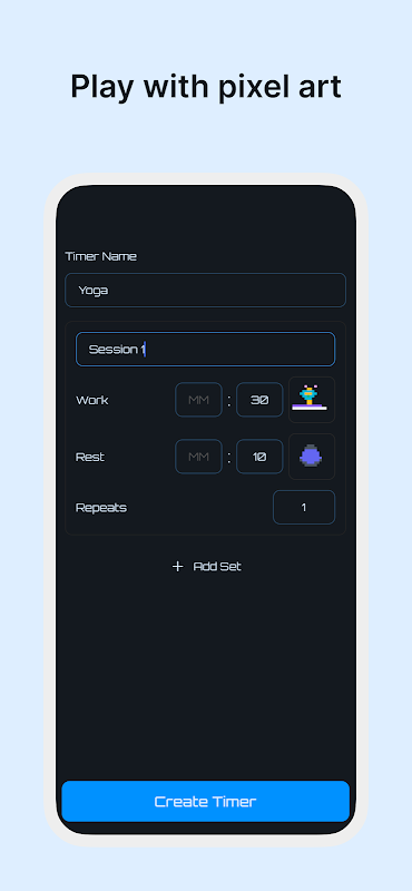 पिक्सेल टाइमर रोज़मर्रा की टाइमिंग को एक मनोरम अनुभव में बदल देता है, जो उत्पादकता, वर्कआउट या बस मज़े के लिए एकदम सही है!