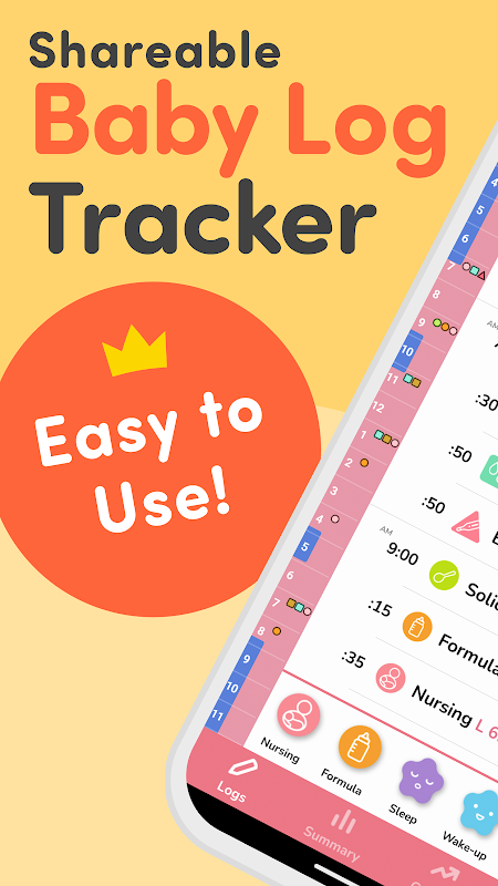 स्तनपान, नींद, बच्चे के खाने, बच्चे के विकास और डायपर के लिए बेबी ट्रैकर।