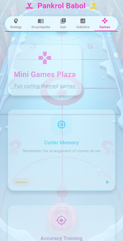 सीखना निष्क्रिय नहीं होना चाहिए। मिनी गेम्स प्लाज़ा तीन कर्लिंग-थीम वाले गेम प्रदान करता है जो आपके दिमाग को चुनौती देते हैं और आपकी कर्लिंग प्रवृत्ति को तेज़ करते हैं।