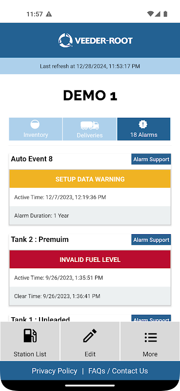 वॉल्यूम, रसाव, जल ऊंचाई, ईंधन ऊंचाई, टैंक स्थिति, साइफन सेट पदनाम और प्रसव प्रगति-सूचक के साथ प्रत्येक जुड़ा स्टेशन के टैंक का एक विस्तार। वे तीनों रिपोर्टें प्रत्येक स्टेशन, सक्रिय अलार्म, वर्तमान इन्वेंटरी और अंतिम प्रसव के लिए उपलब्ध हैं।