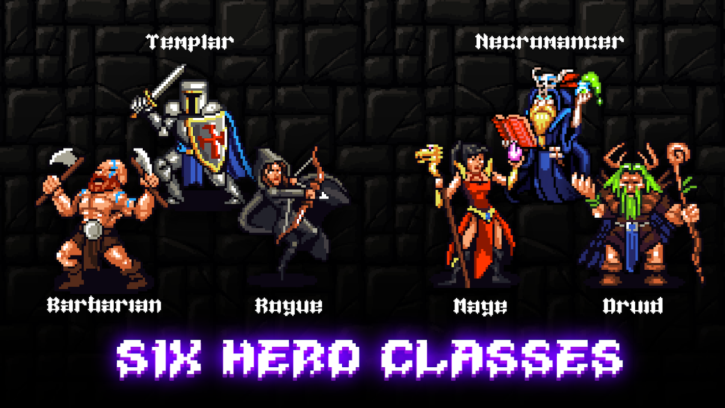 * 6 नायक वर्ग (टेम्पलर, दुष्ट, बारबेरियन, मैज, ड्र्यूड और नेक्रोमैंसर)