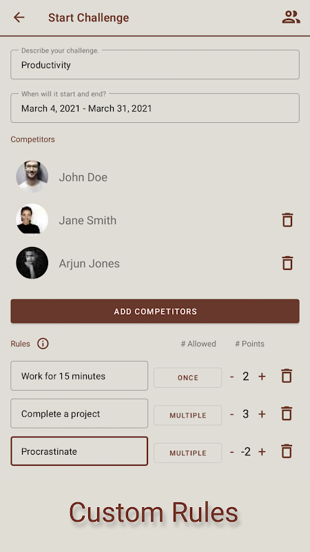 पॉइंटागन में, एक चुनौती में नियमों का एक समूह होता है जिसे आप प्रत्येक दिन पूरा करने का प्रयास करते हैं। नियम कुछ भी हो सकते हैं जो आप चाहते हैं। प्रत्येक नियम के साथ एक बिंदु मान जुड़ा होता है। आपके पास यह निर्दिष्ट करने की क्षमता भी है कि नियम एक दिन में एक बार या एकाधिक बार समाप्त किया जा सकता है या नहीं। ऐप में एक चुनौती शुरू करने के लिए, आप एक साधारण फॉर्म भरते हैं, और अपने दोस्तों और परिवार को आमंत्रित करते हैं। उसके बाद, आप प्रत्येक दिन अर्जित अपने अंक लॉग करते हैं। चुनौती के अंत में सबसे अधिक अंक वाला व्यक्ति जीतता है!
