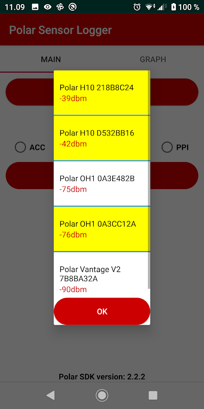 ध्रुवीय H10 और OH1 सेंसर से लॉग इन करें और ग्राफ बायोसिग्नल्स (HR / ECG / ACC / PPG / etc ..)