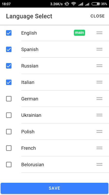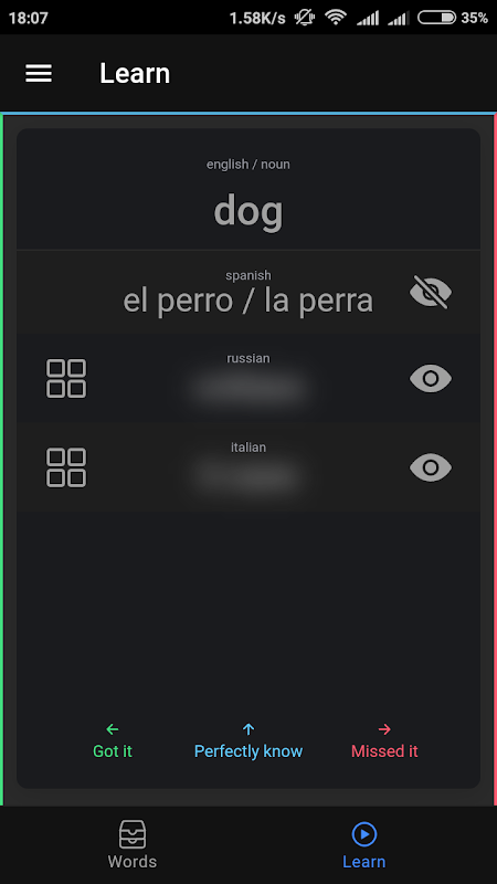 शब्द मिल गया - कार्ड को बाईं ओर स्वाइप करें। यदि शब्द आपके लिए कठिन है - दाईं ओर स्वाइप करें। शब्द को पहले से ज्ञात के रूप में चिह्नित करने के लिए - इसे ऊपर की ओर स्वाइप करें, ताकि यह फिर से दिखाई न दे। वर्तमान में, आप ऐसी भाषाएं सीख सकते हैं: जर्मन, फ्रेंच, स्पेनिश, इतालवी, पोलिश, रूसी, अंग्रेजी, यूक्रेनी और बेलोरूसियन।