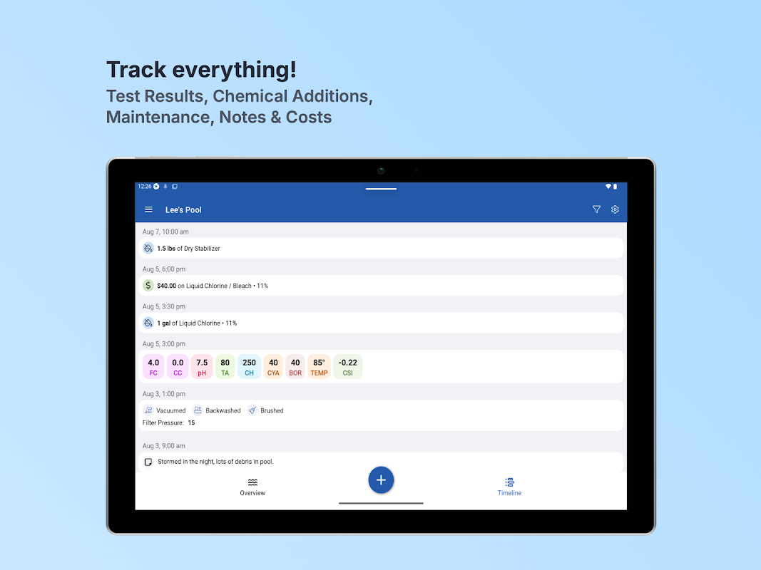 • रखरखाव ट्रैक करें: बैकवाशिंग, वैक्यूमिंग, फ़िल्टर सफाई, फ़िल्टर दबाव, SWG सेल %, प्रवाह दर
