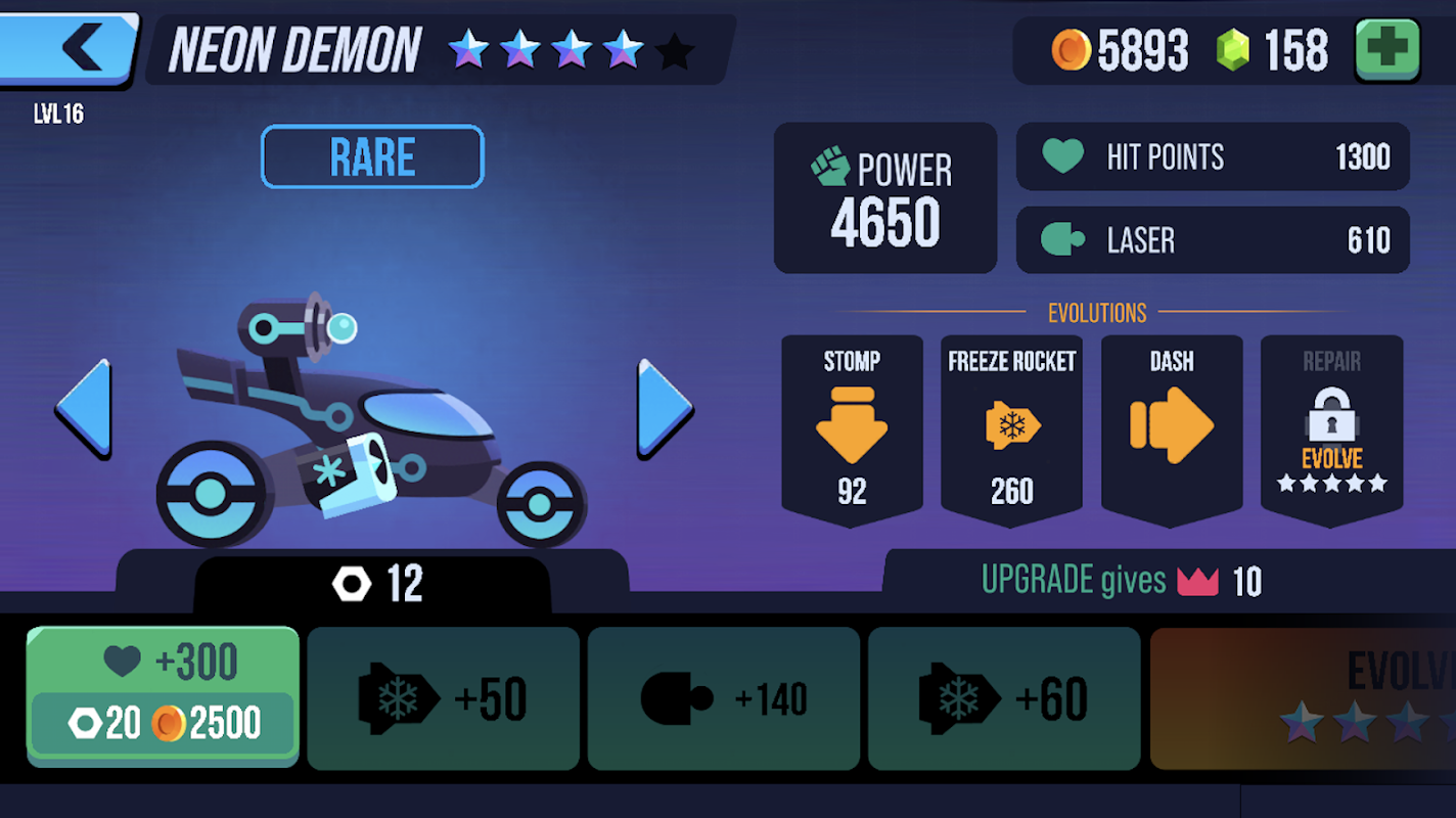 A dozen power machines to choose from. Lasers, bombs, miniguns and shields - upgrade your ride with deadly weapons and destroy your opponent to win the fight!
