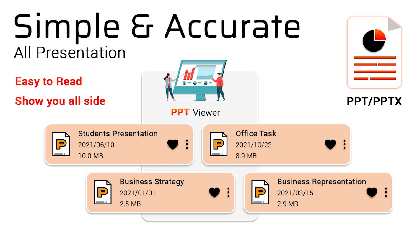 PPT फ़ाइल ओपनर सभी PPT फ़ाइलें खोल सकता है और आप PPT दस्तावेज़ व्यूअर पर सभी प्रस्तुतियाँ पढ़ सकते हैं। अपने स्मार्टफोन में किसी भी पीपीटी फाइल को खोलने के लिए यह बहुत जरूरी है। कार्यालय पाठक और स्कूल व्याख्यान दस्तावेज़ पाठक स्मार्टफोन पीपीटी व्यूअर पर उसकी प्रस्तुति को आसानी से पढ़ सकते हैं। स्लाइड व्यूअर पर किसी भी प्रेजेंटेशन को पढ़ने के लिए एक विशेष प्रेजेंटेशन व्यूअर होता है। पीपीटी को पढ़ने में आसान और केवल एक क्लिक से किसी के साथ साझा करें। किसी भी पीपीटी फाइल को आसानी से पढ़ने के लिए जूम-इन-आउट के लिए टू-फिंगर जेस्चर है।