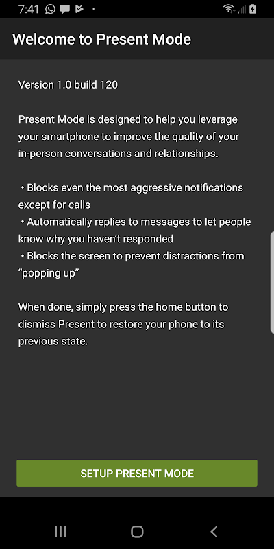 प्रेजेंट आपको दूसरों को उपस्थिति देने के लिए अपने स्मार्टफोन का लाभ उठाने में मदद करता है, जिससे बदले में अधिक उपस्थिति मिलती है, और परिवार और दोस्तों के लिए एक प्रेरक रोल मॉडल बन जाता है।