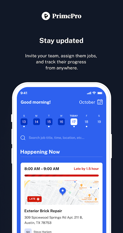 प्राइमप्रो ऑन-डिमांड वर्कर्स के लिए एक टूल है। प्राइमप्रो ग्राहकों से ऑर्डर प्राप्त करना, नौकरी की प्रगति को ट्रैक करना और अपनी टीम के साथ संवाद करना आसान बनाता है - सभी एक ऐप में! उपयोगकर्ता नौकरियां बना सकते हैं जहां वे ऐप में अपनी नौकरी या कार्यों के हर विवरण को कैप्चर कर सकते हैं और उन्हें टीम के साथी को सौंप सकते हैं। वे एक ही स्थान पर विवरण अपडेट कर सकते हैं, जानकारी को शीघ्रता से साझा कर सकते हैं और उन्हें एक ही स्थान पर आसानी से व्यवस्थित कर सकते हैं। उपयोगकर्ता नौकरी की प्रगति की रीयल-टाइम ट्रैकिंग के साथ अद्यतन रहकर समन्वय कार्यों से भी समय बचाते हैं। इससे उन्हें पता चलता है कि उनकी टीम का साथी कहां है और वे नौकरी में कितनी दूर हैं। अंत में, केंद्रीकृत चैट के साथ, उपयोगकर्ता ऐप पर सभी के साथ संवाद कर सकते हैं और चलते-फिरते नौकरियों का प्रबंधन कर सकते हैं। प्राइमप्रो संचार में अनावश्यक आगे और पीछे कटौती करने में मदद करता है और इसे आसान और सरल बनाता है।