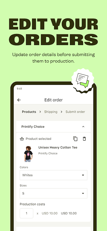 आप जहाँ भी हों, अपने प्रिंट-ऑन-डिमांड व्यवसाय से जुड़े रहें। प्रिंटिफाई मोबाइल ऐप के साथ, आप आसानी से अपने ऑर्डर प्रबंधित कर सकते हैं, पूर्ति की निगरानी कर सकते हैं और अपने ग्राहकों को खुश रख सकते हैं - और वह भी अपने फ़ोन से।
