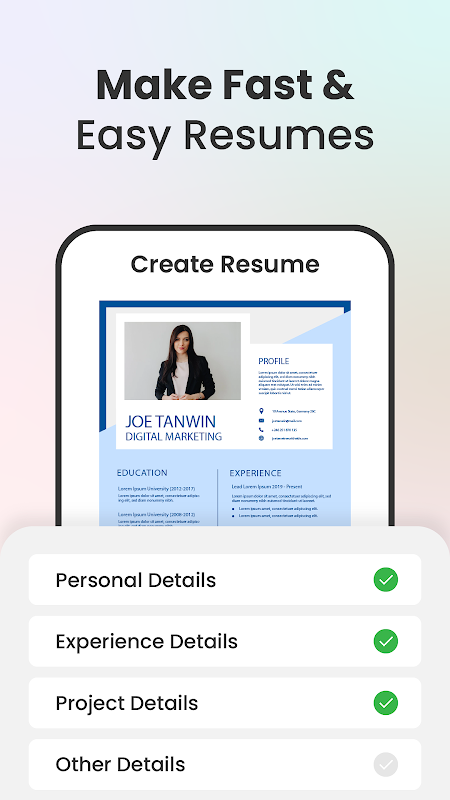 सीवी/रिज्यूमे बिल्डर ऐप के साथ कुछ ही मिनटों में एक पेशेवर रिज्यूमे बनाएं
