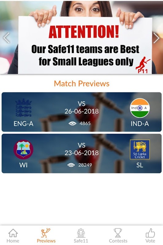 * Safe11: यह स्क्रीन प्रत्येक मैच के लिए विशेष रूप से छोटी लीग के लिए सबसे अच्छी फंतासी टीम देती है।